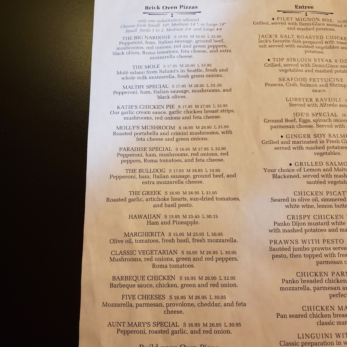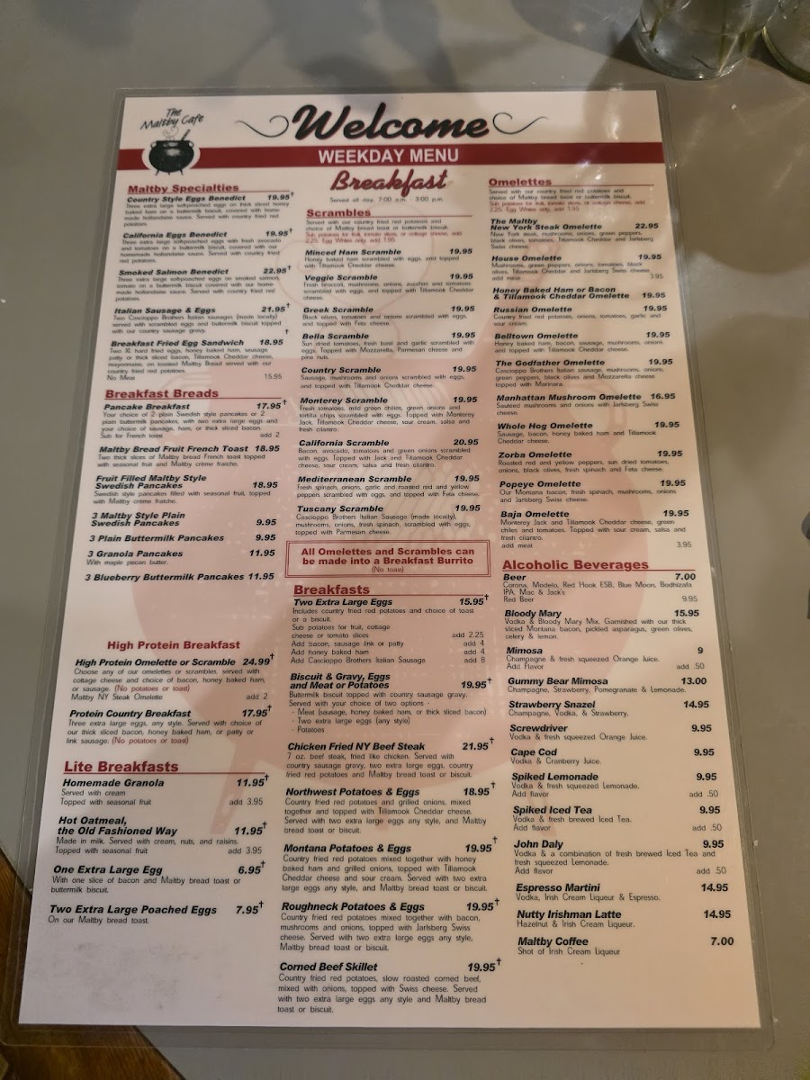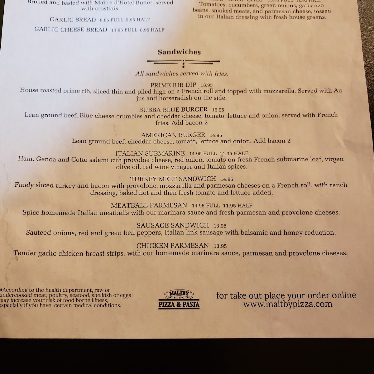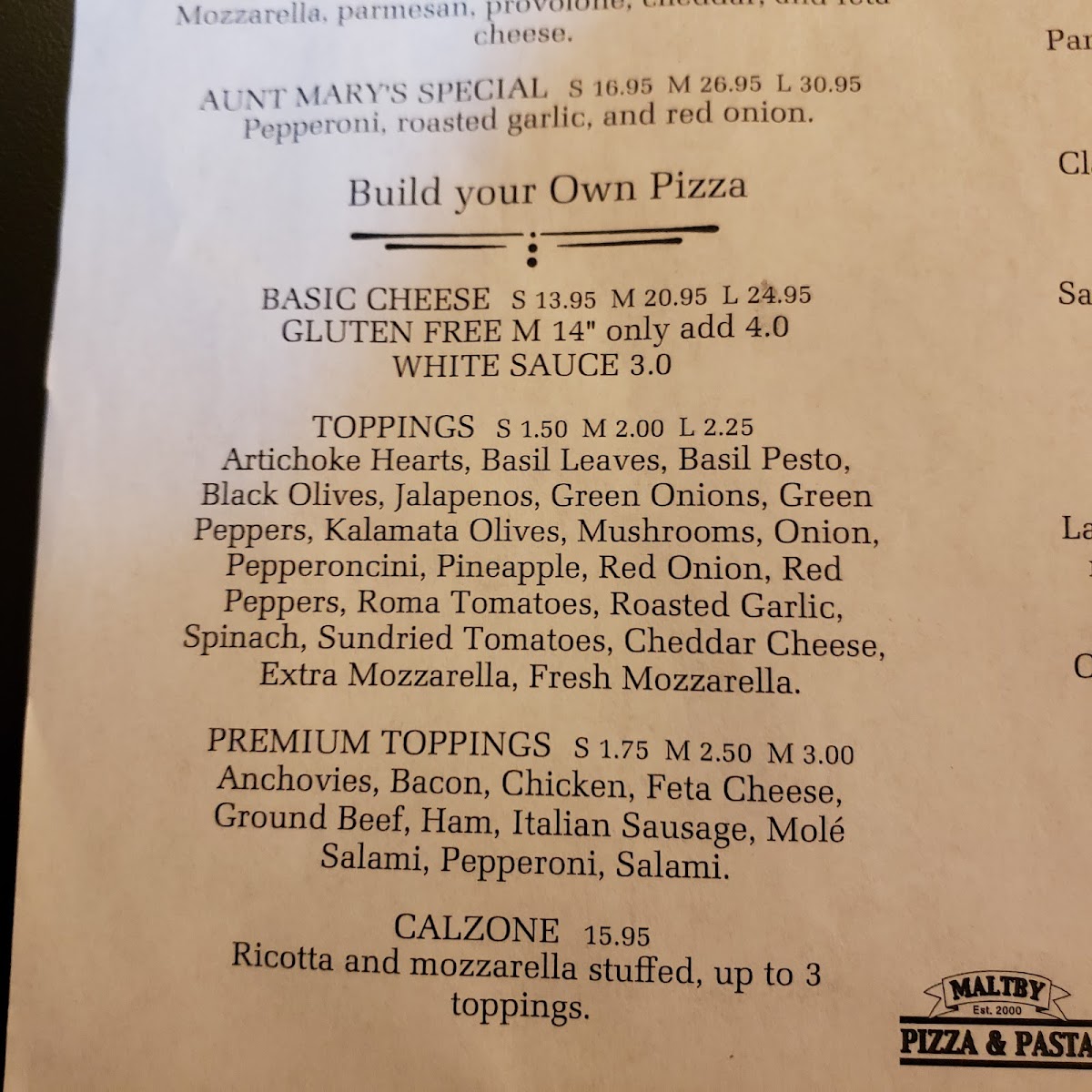 The menu at Maltby Pizza & Pasta features a variety of Italian dishes, with a focus on both pizza and pasta offerings. The menu is organized into several groups, including Build Your Own pizzas, Specialties of the House pizzas, lunch specials, salads, sandwiches, and beverages.