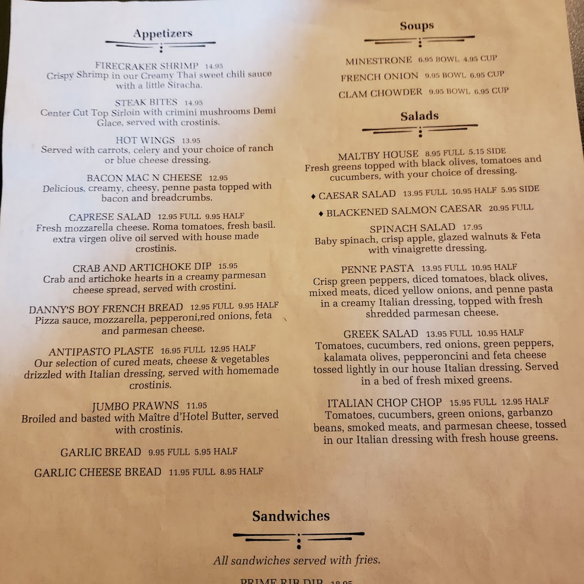 The menu also includes several salad options like Greek Salad and the Italian Chop Chop, as well as pasta dishes such as spaghetti and clams linguine. Other offerings include various chicken dishes, buffalo wings, and a selection of beers including porter varieties.