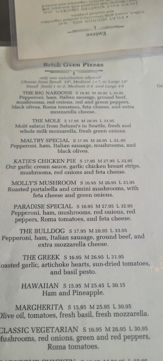 Specialty pizzas include combinations such as The Big Nardone with multiple meats and vegetables, the Maltby Special featuring pepperoni and sausage, Katie's Chicken Pie with garlic cream sauce and chicken breast strips, and the Hawaiian pizza with ham and pineapple.